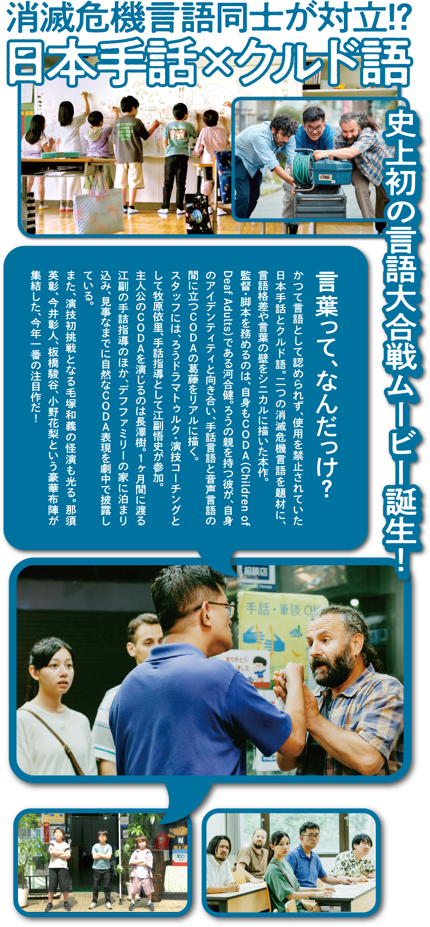 映画の登場人物たちと同じように、日本語・日本手話・クルド語が入り乱れ、ああだこうだと言い合う現場でした。言葉の壁を乗り越えるというよりは言葉の壁を使って遊ぶような日々でした。
